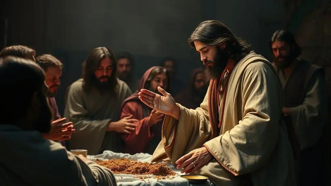 Durante a ceia, Jesus pegou o pão, deu graças e o quebrou. Ele disse que aquele pão simbolizava seu corpo. Isso mostra como Ele estava disposto a se sacrificar por todos nós. É um gesto profundo de amor e entrega.